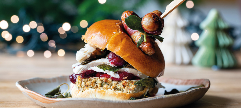 Burger με κιμά γαλοπούλας, παντζάρι, χαλούμι & λουκάνικα