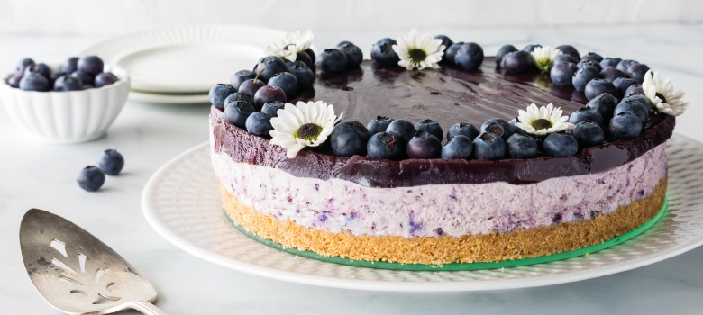 Βγάζετε το γλυκό από τη φόρμα και γαρνίρετε με τα μύρτιλα.