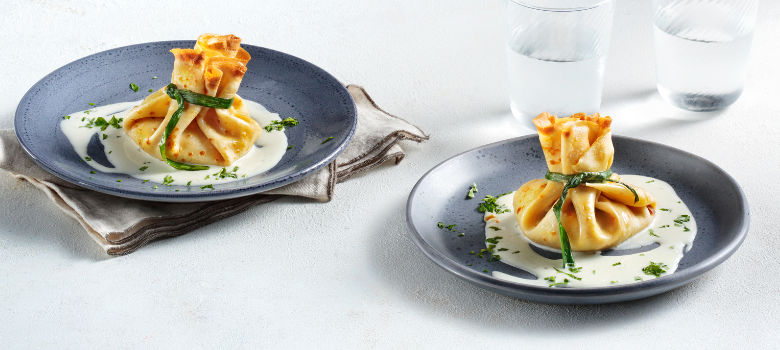 Κλείνετε κάθε κρέπα σε πουγκί και τη δένετε µε µία λωρίδα από το ζεµατισµένο κρεµµύδι.