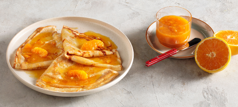 Ζεσταίνετε σε τηγάνι το βούτυρο, τη ζάχαρη, το χυμό, το ξύσμα πορτοκαλιού και 2 κουταλιές από το λικέρ. Βουτάτε μία-μία τις κρέπες στο μίγμα βουτύρου, τις διπλώνετε στα 4, τις βάζετε στις άκρες του τηγανιού και πασπαλίζετε με τη ζάχαρη. Ρίχνετε στο κέντρο το υπόλοιπο λικέρ και το κονιάκ, βάζετε φωτιά και σερβίρετε αμέσως.