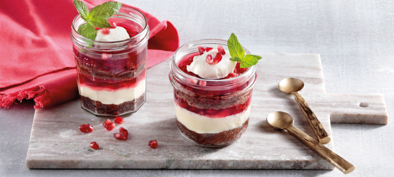 Ετοιμάζετε το 1·2·Bake! Μίγμα για Muffins Σοκολάτα, σύμφωνα με τις οδηγίες της συσκευασίας και ψήνετε σε μια ταρτιέρα με λαδόκολλα διαμέτρου 22-24 εκατοστών, για μισή ώρα. Ετοιμάζετε την Κρέμα Ζαχαροπλαστικής με γεύση Βανίλια ΓΙΩΤΗΣ, σύμφωνα με τις οδηγίες του φακέλου, και τη βάζετε σε κορνέ. Ετοιμάζετε το Φρουί Ζελέ Ρόδι ΓΙΩΤΗΣ, προσθέτοντας το μισό ρόδι. Απλώνετε το Φρουί Ζελέ σε λεπτή στρώση, σε μεσαίο ταψί, ώστε να παγώσει και να μπορείτε να το κόψετε. Ετοιμάζετε το Garni με γεύση Βανίλια ΓΙΩΤΗΣ, σύμφωνα με τις οδηγίες του κουτιού, και το βάζετε σε ένα κορνέ. Κόβετε τα muffins με τη βοήθεια μια μικρής φόρμας σε στρογγυλά κομμάτια, στο μέγεθος του ποτηριού που θα γεμίσετε, και κάθε κομμάτι το κόβετε στη μέση. Βάζετε το ένα κομμάτι στον πάτο του ποτηριού από πάνω, απλώνετε την έτοιμη κρέμα ζαχαροπλαστικής, ένα κομμάτι Φρουί Ζελέ, κομμένο στο μέγεθος του ποτηριού, πάνω από το άλλο κομμάτι muffins, ένα ακόμα κομμάτι Φρουί Ζελέ και τέλος, γαρνίρετε με το Garni και το υπόλοιπο ρόδι.
