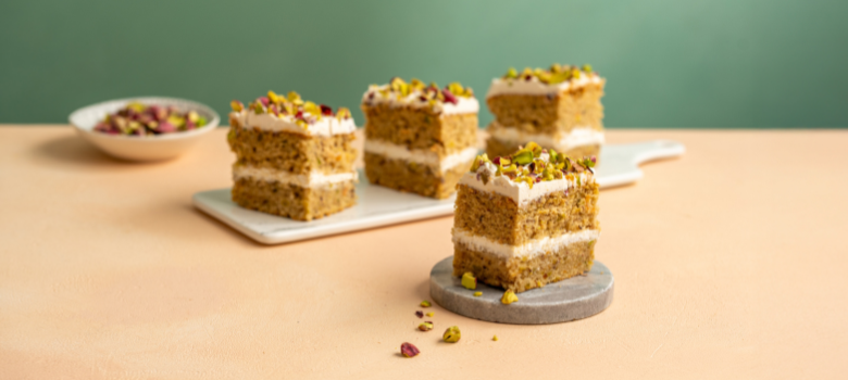 Σε ένα μπολ ανακατεύετε τα τριμμένα φιστίκια Αιγίνης, το τριμμένο καρότο, την κανέλα, το Μπέικιν Πάουντερ ΓΙΩΤΗΣ και το Αλεύρι για Όλες τις Χρήσεις ΓΙΩΤΗΣ και τα ενσωματώνετε σιγά-σιγά μέσα στο μίγμα του κάδου.